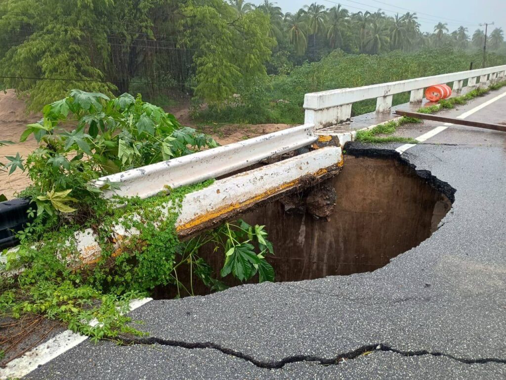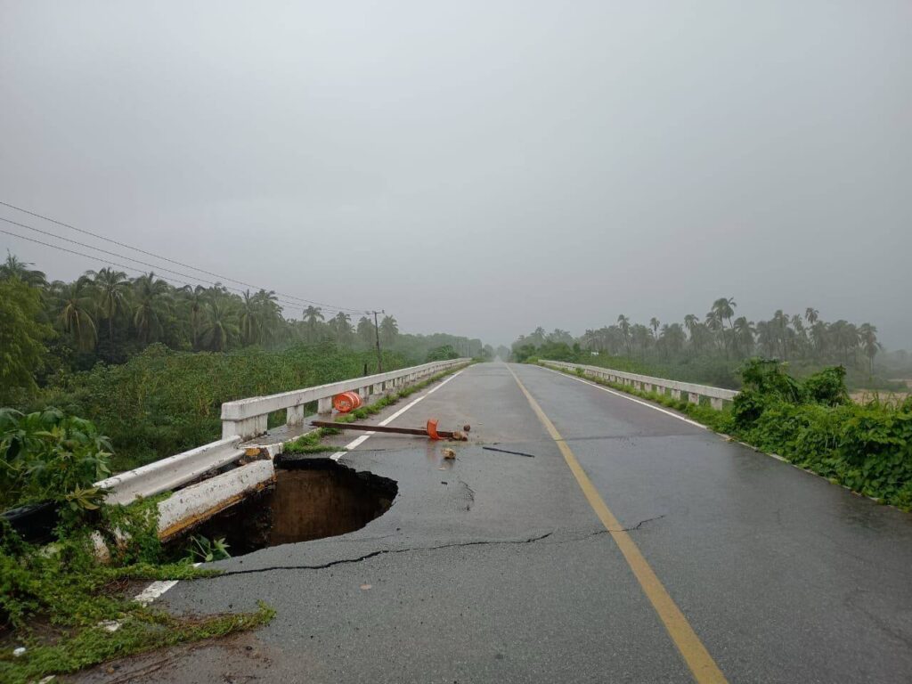 Carretera Pinotepa Nacional–Salina Cruz, km 142+550, por daños en el drenaje.