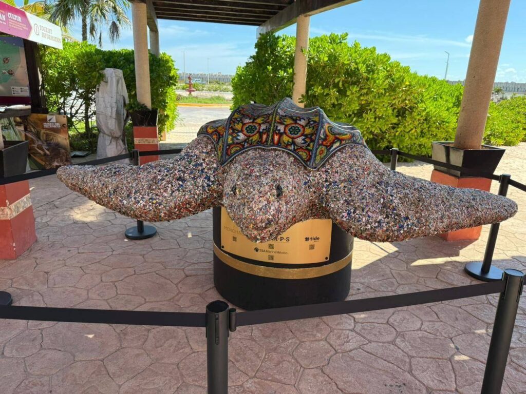 Con el objetivo de generar conciencia ambiental y compartir la riqueza cultural de México, la Terminal Internacional de Cruceros de Progreso exhibe desde esta semana la escultura “Tortuga: arte en el agua”, una obra monumental del maestro César Menchaca, creada a partir de plástico recuperado del mar e intervenida con chaquira de cristal bajo la técnica wixárika.