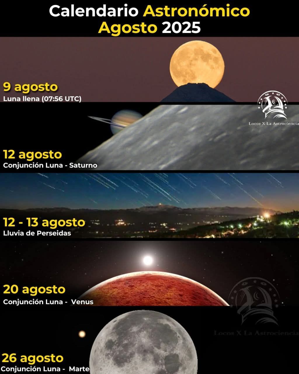 Agosto de 2025 será un mes inolvidable para quienes disfrutan de observar el firmamento. Diversos fenómenos astronómicos —visibles a simple vista en muchas regiones del planeta— adornarán el cielo, desde conjunciones planetarias hasta una de las lluvias de meteoros más intensas del año. A continuación, te presentamos las fechas clave para no perderte ninguno: