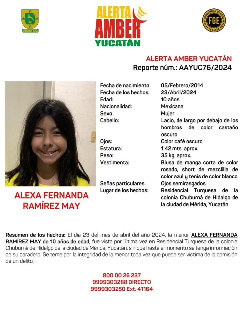 AAYUC Informa de la ACTIVACIÓN de una ALERTA AMBER Estatal solicitando de su amable apoyo para la búsqueda y localización de la menor ALEXA FERNANDA RAMÍREZ MAY de 10 años de edad, en el Estado de Yucatán.