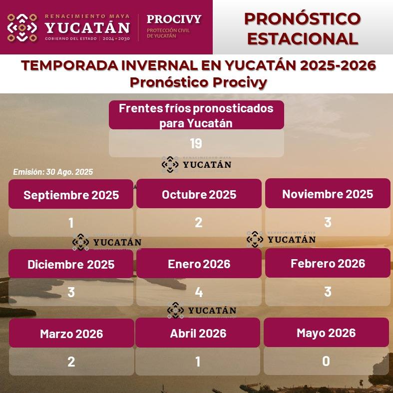 De igual forma, anunció que el 15 de septiembre iniciará la temporada invernal 2025-2026, que se extenderá hasta el 15 de mayo próximo. A nivel nacional se esperan alrededor de 50 sistemas frontales, de los cuales al menos la mitad influirá en la Península de Yucatán.