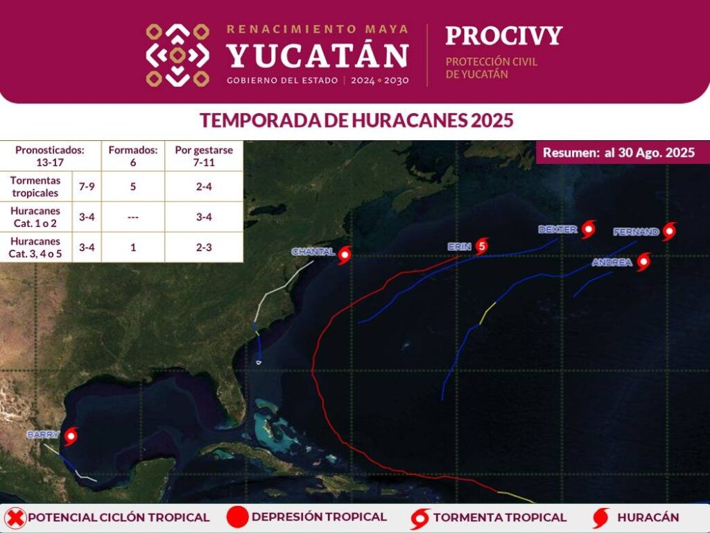 Hasta el momento, en el Atlántico, Golfo de México y Mar Caribe se han formado seis sistemas tropicales con nombre: cinco tormentas tropicales —Andrea, Barry, Chantal, Dexter y Fernand— y un huracán categoría 5, Erin. Ninguno representó riesgo para Yucatán. Asimismo, se han contabilizado 29 ondas tropicales, que en combinación con vaguadas han generado lluvias dispersas en diferentes zonas de la entidad.