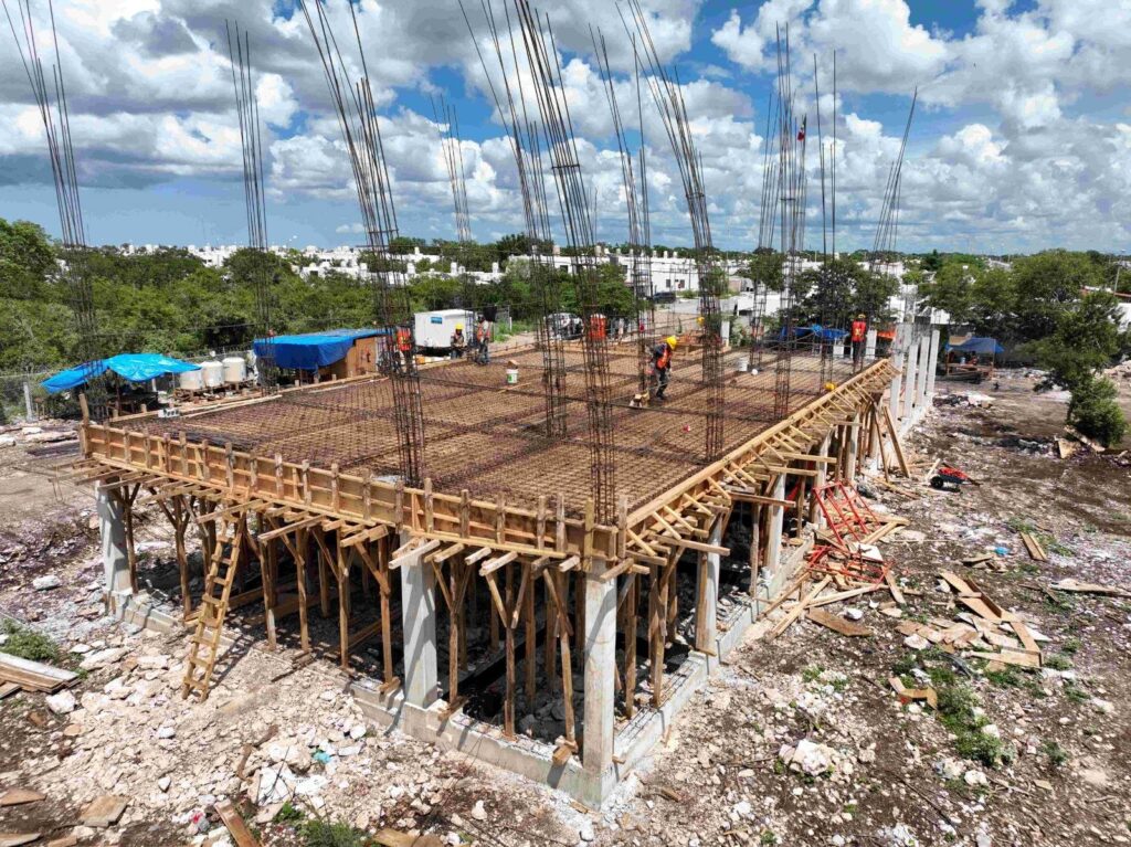 Durante este primer mes de labores, se completó la cimentación en ambos edificios y el colado de 60 columnas correspondientes a la planta baja. De manera simultánea, se trabaja en el armado y cimbrado de las losas de la planta alta, con lo que se prepara la estructura para continuar con la construcción vertical.