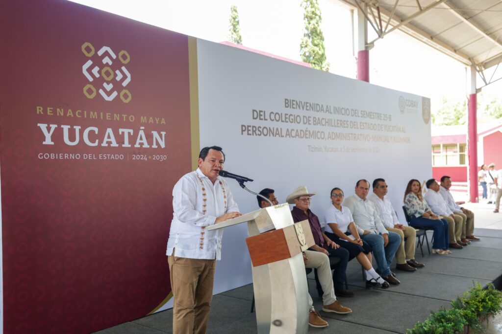 Tizimín, Yucatán, 4 de septiembre de 2025.- El Gobernador Joaquín Díaz Mena anunció importantes mejoras para el Colegio de Bachilleres de Yucatán (Cobay) de Tizimín, donde se rehabilitará el laboratorio de química, se renovará el salón de cómputo con nuevo equipo y se construirá, en 2026, una cancha de futbol 7.