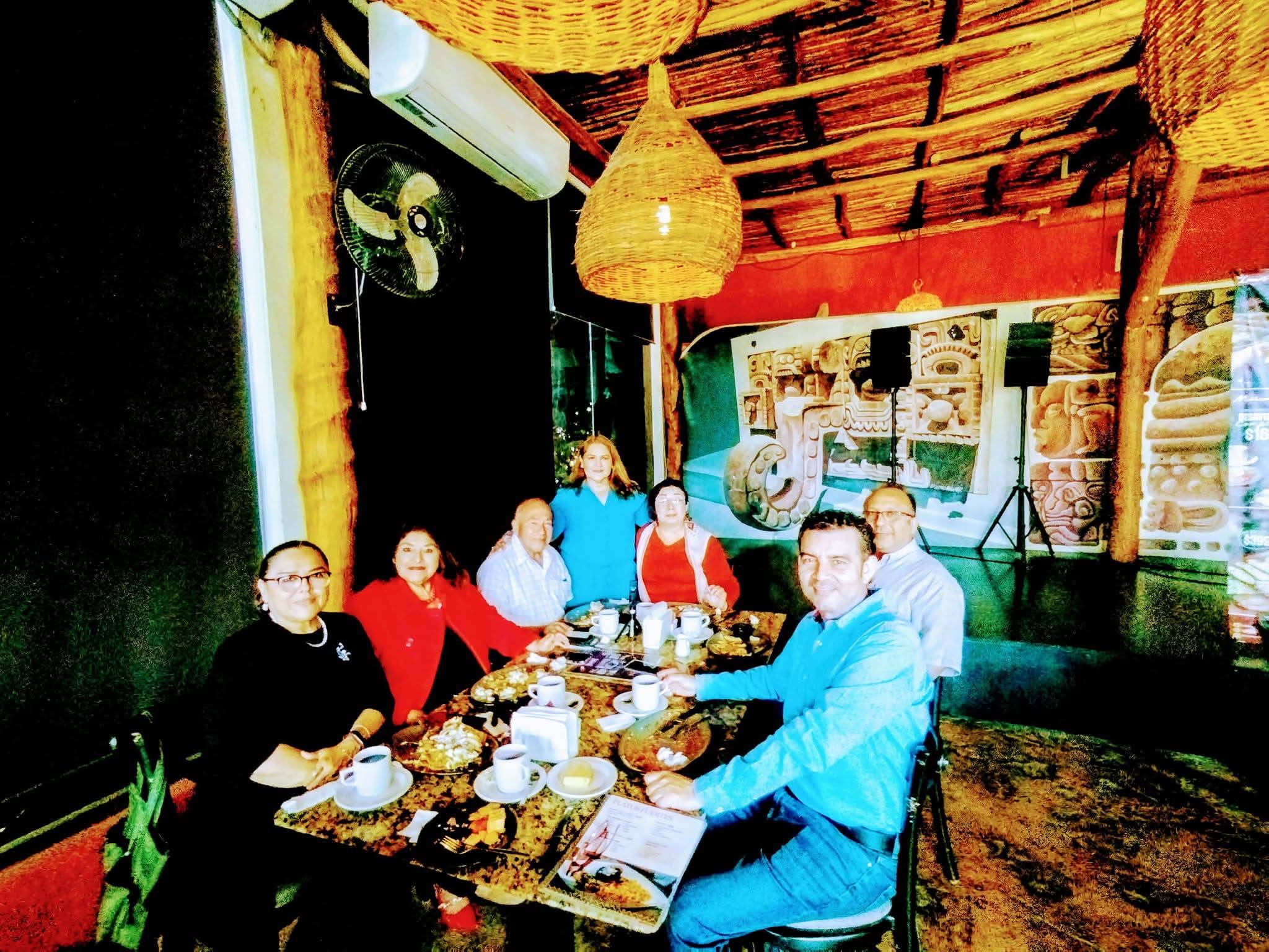 En la imagen del convivio aparecen, de derecha a izquierda, el locutor Gilmer Soberanis, Fausto Priego, Adriana Vargas León, Cecilia Trueba, Anatolio Narváez Canché, Charito Cetina y Ligia Sosa, integrantes del Comité Directivo del CLY.