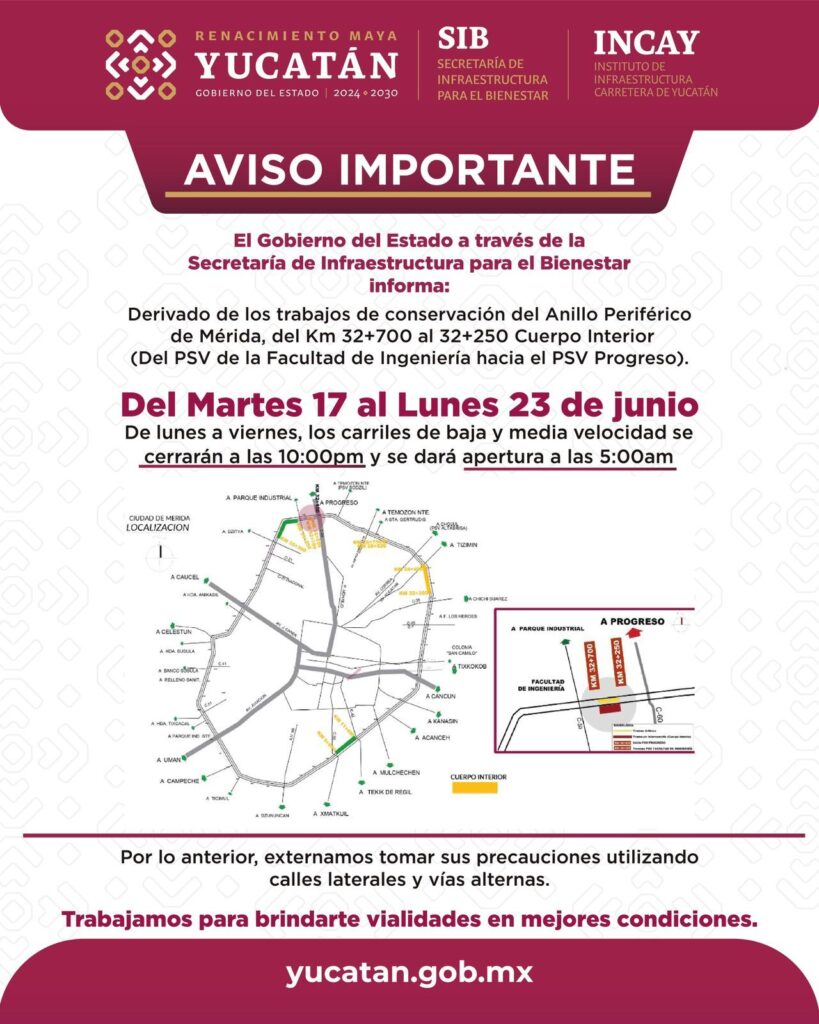 El Gobierno del Estado de Yucatán, a través de la Secretaría de Infraestructura para el Bienestar y el Instituto de Infraestructura Carretera de Yucatán (INCAY), informa a la ciudadanía que han concluido satisfactoriamente los trabajos de conservación del Anillo Periférico de Mérida, en el tramo comprendido del kilómetro 35+300 al 33+250 del cuerpo interior, que va del puente de Dzityá hacia el puente de la Facultad de Ingeniería.