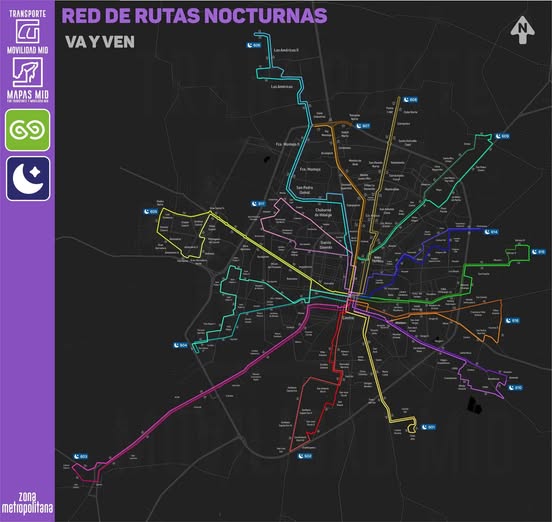 Te compartimos el mapa completo de la red de transporte nocturno, saliendo desde su base en el Palacio de la Música desde las 10:30 pm en adelante. ![]()