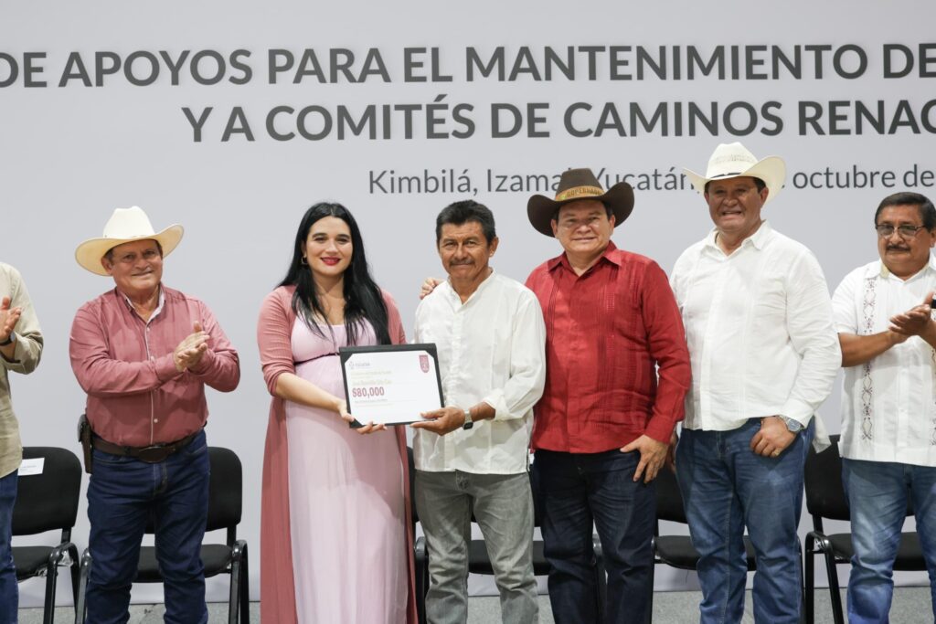 Posteriormente, en Izamal, Díaz Mena encabezó la entrega de apoyos del programa Renacimiento Maya, que incluyó recursos para el mantenimiento de planteles henequeneros, apoyo a comités de Caminos Renacimiento, paquetes de mejoramiento genético y el anuncio de la construcción de un Centro Pilares Renacimiento.