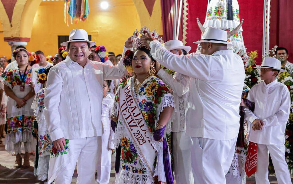 Posteriormente, el Gobernador se trasladó a Tetiz para encabezar la celebración en honor a la Virgen de la Asunción, donde coronó a la embajadora de la Feria Tradicional 2025, Vianey Guadalupe Cuytún; a la embajadora de la tercera edad, Candelaria Balam, y a la embajadora infantil, Jade Ávila.
