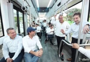 gobernador Mauricio Vila Dosal, a bordo de una de las unidades del Ie Tram, cuya ruta La Plancha- estación del Tren Maya, será inaugurada este sábado con la presencia del presidente Andrés Manuel López Obrador.