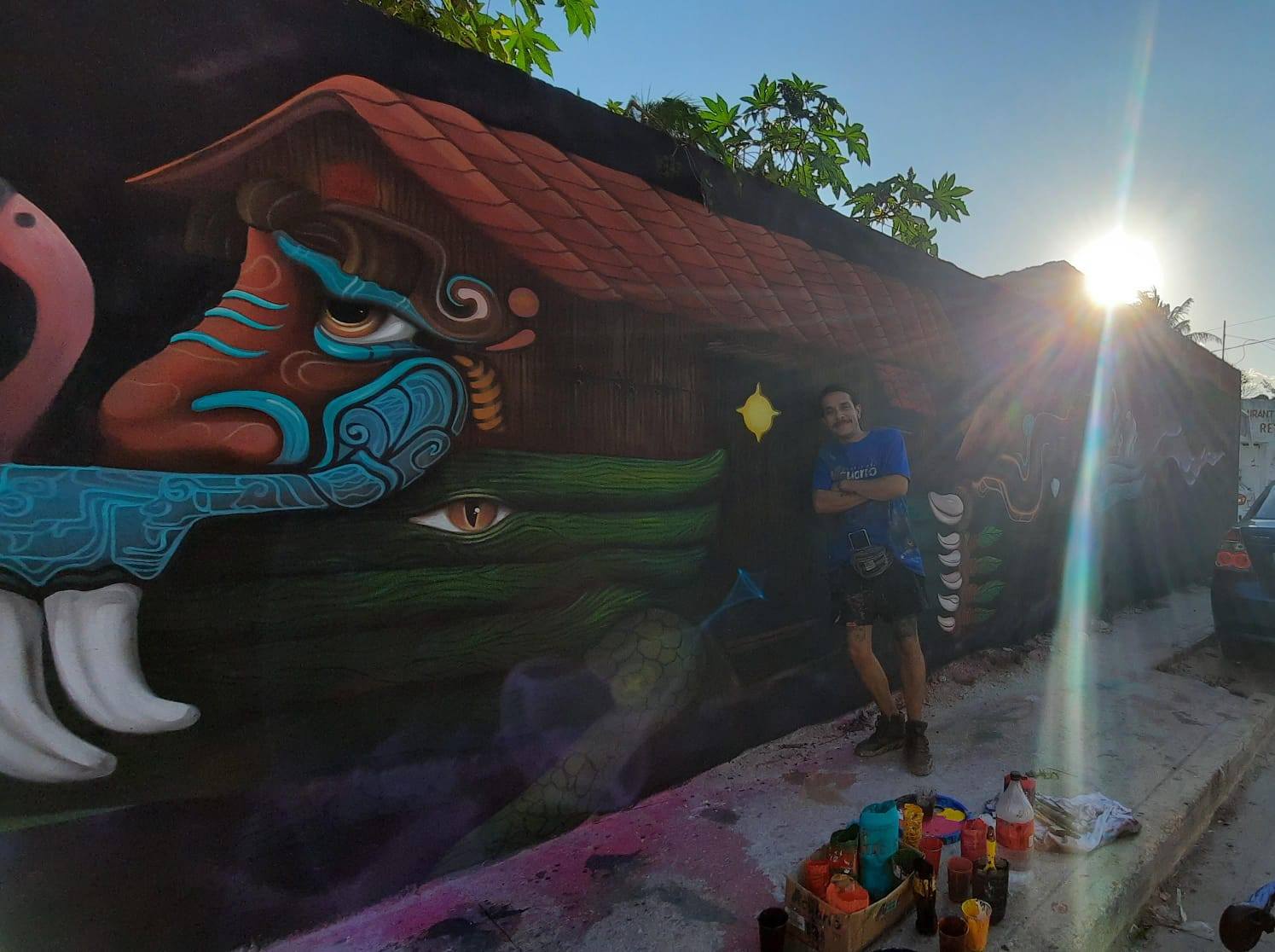 El artista plástico Carlos Vázquez Macías convirtió un muro del lugar en una pieza monumental que entrelaza la cosmovisión maya con la riqueza natural de la región, como parte del Festival Renace Internacional.
