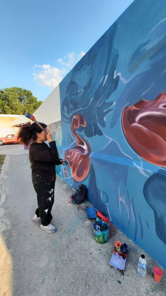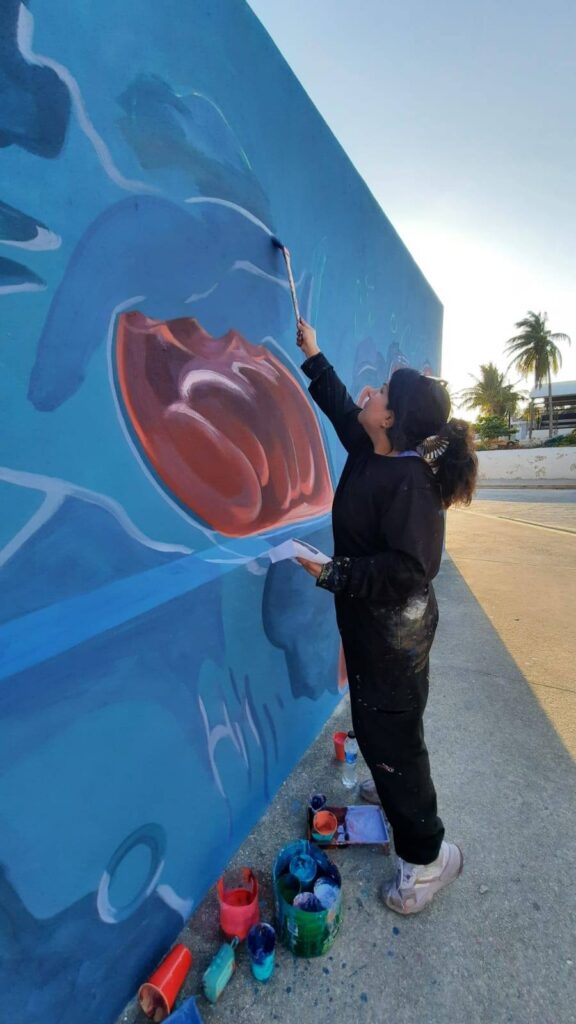 Originaria de la Ciudad de México, la muralista encontró en Sisal un escenario completamente distinto al entorno urbano del que proviene. Ese contraste influyó profundamente en su proceso creativo y en el mensaje de su obra.