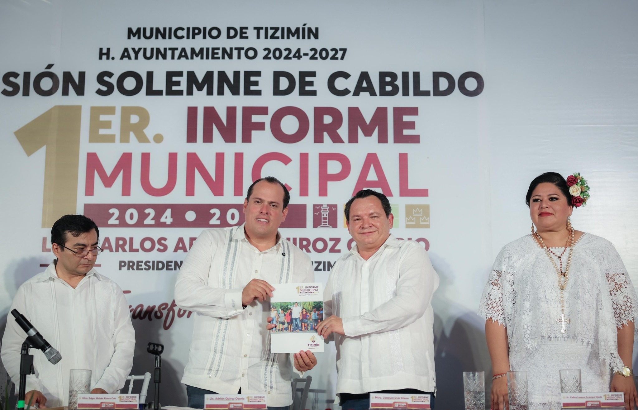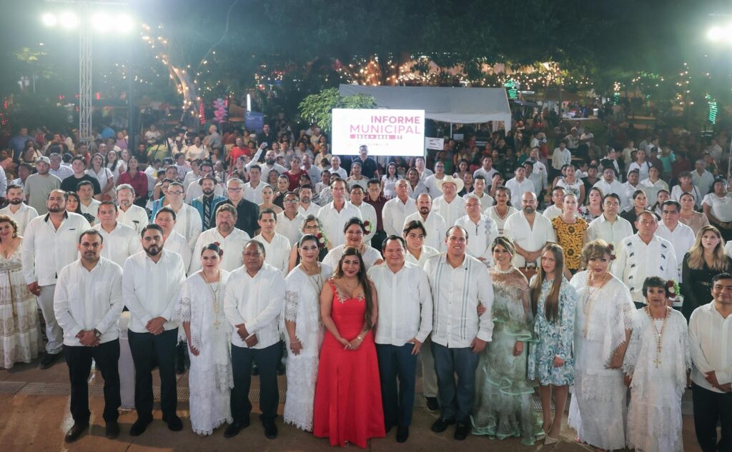 Durante el primer informe de gobierno del alcalde, el mandatario estatal, acompañado de su esposa, la presidenta honoraria del DIF Yucatán, Mtra. Wendy Méndez Naal, destacó que la transformación se construye de la mano con la ciudadanía, recorriendo colonias y comisarías para escuchar y atender sus necesidades.