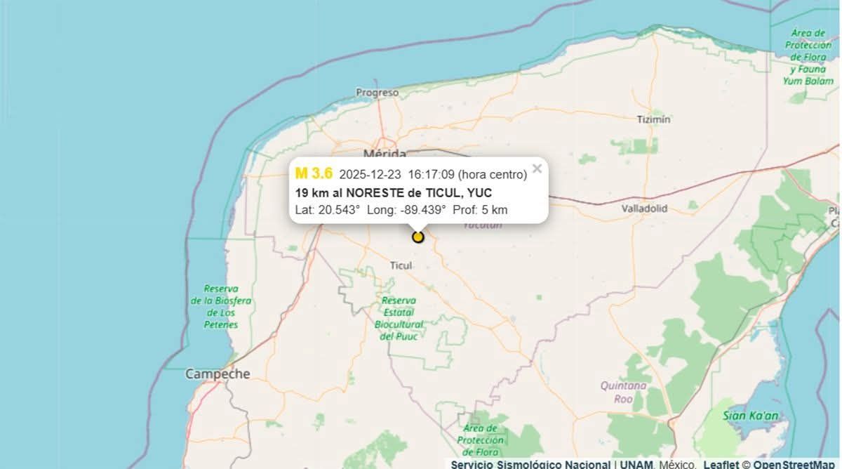 La tarde de este martes 23 de diciembre de 2025, autoridades confirmaron un sismo de magnitud 3.6 con epicentro a 19 km al noreste de Ticul, Yucatán, muy cerca de las comunidades de Aguada Polol, Chapab, Mahzucil y Tecoh. El movimiento ocurrió a las 16:17 horas y fue localizado a una profundidad de apenas 5 km, lo que generó una ligera oscilación de objetos perceptible para algunas personas en la zona.