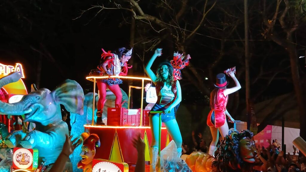 Posteriormente hicieron su aparición los reyes del Carnaval, Sara I y Javo I, seguidos por comparsas infantiles y de adultos que representaron a diversas colonias y grupos especiales, todos caracterizados bajo la temática circense.