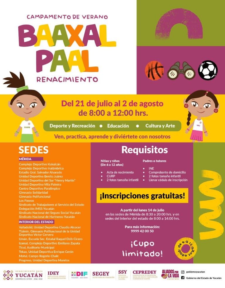 MÉRIDA, YUCATÁN, 14 DE JULIO DE 2025.– Con el propósito de fomentar el desarrollo integral, la sana convivencia y el aprovechamiento del tiempo libre durante las vacaciones escolares, el Gobierno del Estado de Yucatán, a través del Instituto del Deporte del Estado de Yucatán (IDEY), convoca a niñas y niños de entre 6 y 12 años al Campamento de Verano “Baaxal Paal Renacimiento” 2025.
