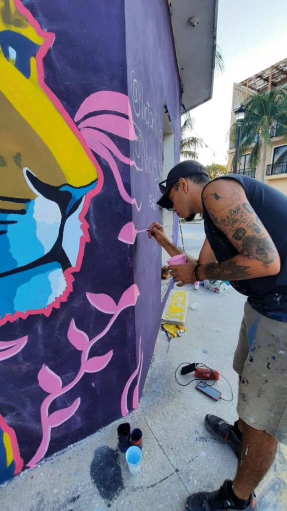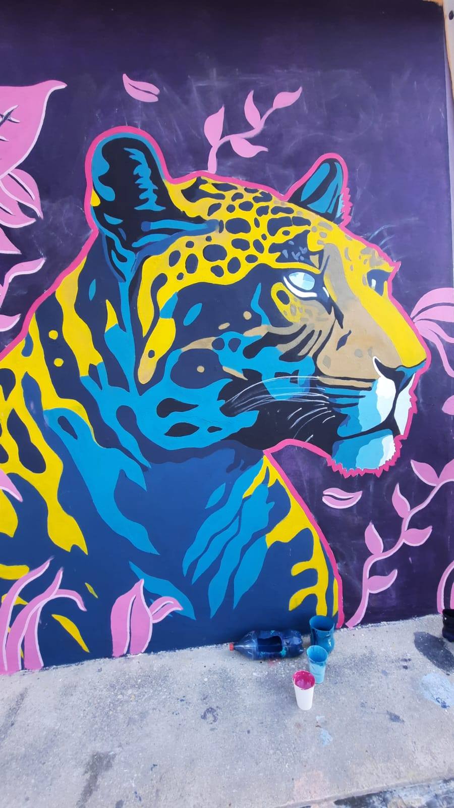 El artista Víctor Villa, originario de Ciudad Mante, Tamaulipas, presentó un mural en el que integra la figura de un jaguar con rasgos de tigre, rodeado de abundante vegetación y matices vibrantes que evocan la biodiversidad característica de Sisal.