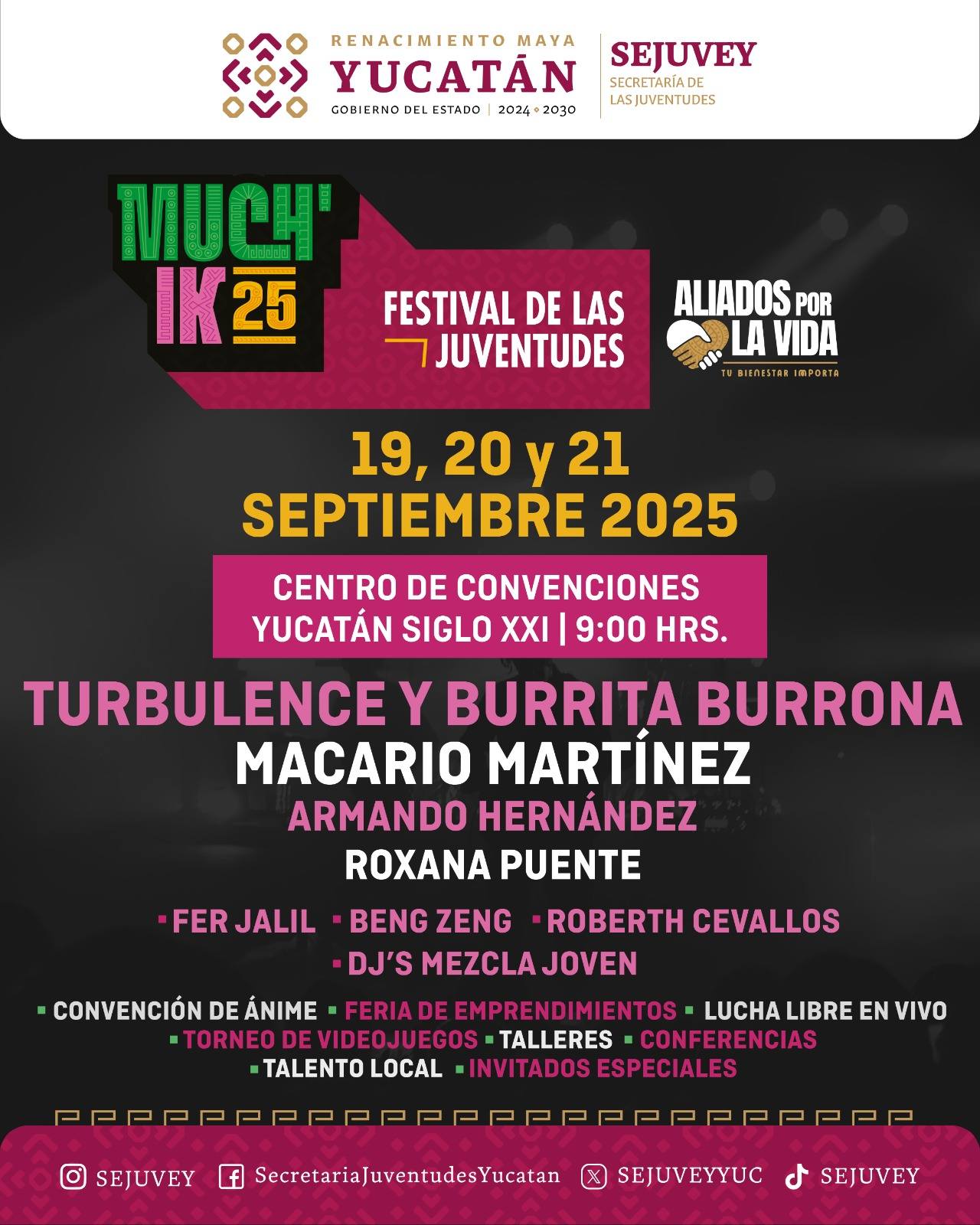 El Gobierno del Estado de Yucatán, a través de la Secretaría de las Juventudes (Sejuvey), informa que el Much’Ik Festival de las Juventudes 2025, originalmente anunciado para este fin de semana, se realizará los días 19, 20 y 21 de septiembre en el Centro de Convenciones Yucatán Siglo XXI.
