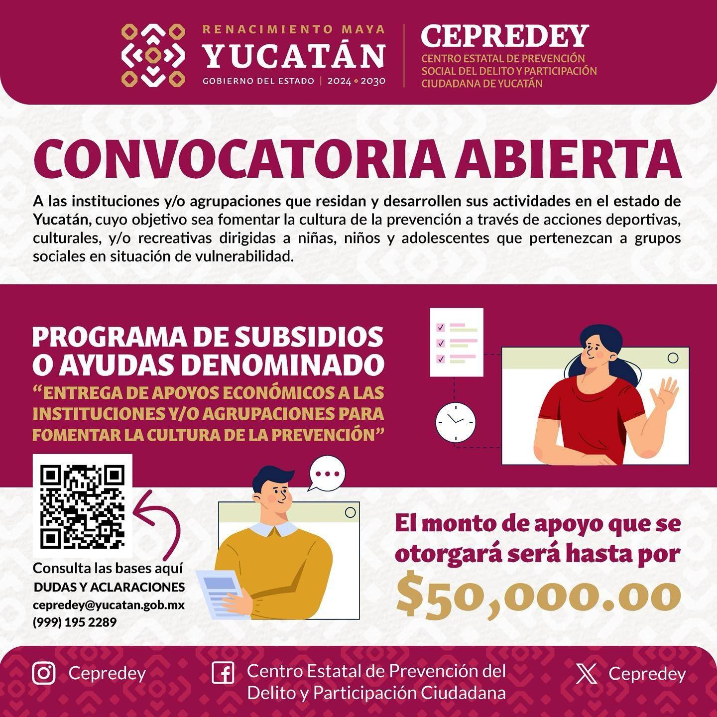 MÉRIDA, Yuc., 19 de junio de 2025.– Con el objetivo de fortalecer entornos seguros y fomentar la participación ciudadana en zonas de alta vulnerabilidad, el Gobierno del Estado de Yucatán, a través del Centro Estatal de Prevención Social del Delito y Participación Ciudadana (Cepredey), emitió la Convocatoria 2025 del programa de subsidios “Entrega de apoyos económicos a instituciones y/o agrupaciones para fomentar la cultura de la prevención”.