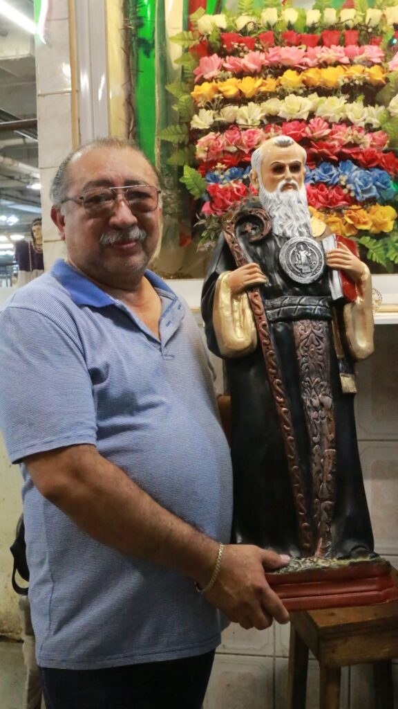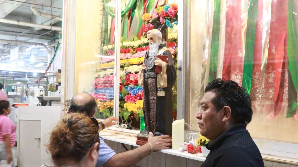 MÉRIDA, Yucatán, 26 de junio de 2025.– Después de 21 años de existencia, el Mercado de San Benito finalmente cuenta con la imagen de su santo patrón. A iniciativa de la Unión de Baratilleros que preside Ángel Enrique Sánchez Dzul, este miércoles fue colocada y bendecida la figura de San Benito en un nicho ubicado en el área de carnes del emblemático centro de abasto.