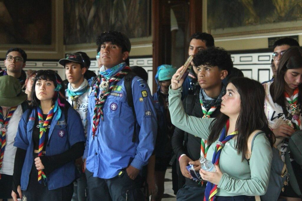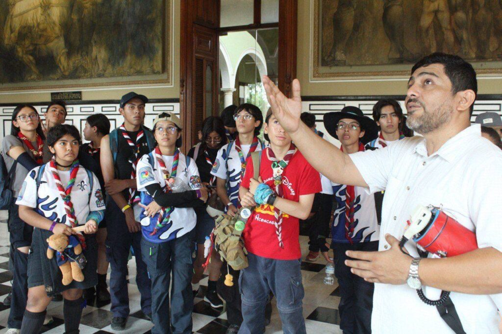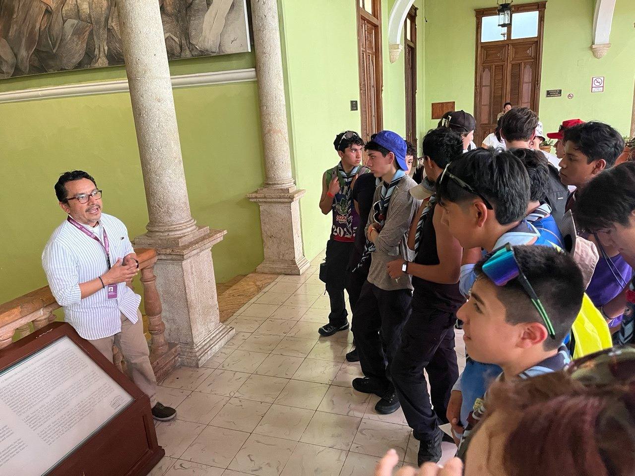 Durante el recorrido por el Palacio de Gobierno, el grupo escultista fue guiado por personal del GMMM, encabezado por el maestro Julián Dzul Nah, director técnico del recinto, y el coordinador de Curaduría e Investigación, Ángel Gutiérrez Romero, quienes ofrecieron una explicación detallada sobre el valor artístico e histórico de los murales del pintor yucateco Fernando Castro Pacheco, ubicados en el Salón de la Historia y otras áreas del edificio.