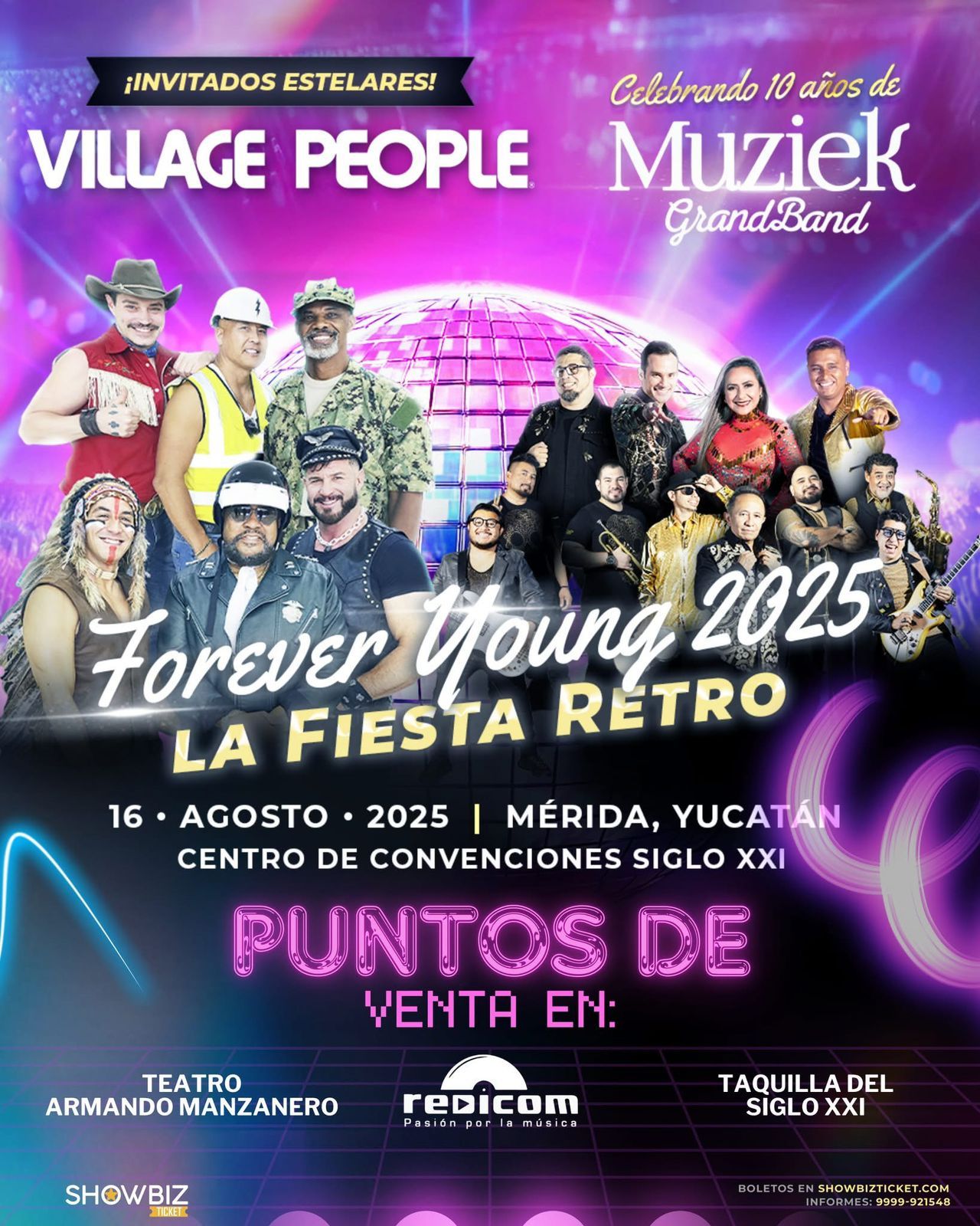 Como parte de esta celebración especial, el evento contará con la participación estelar de Village People, íconos mundiales de la música disco, conocidos por clásicos como Y.M.C.A., Macho Man y In the Navy. Junto a ellos, Muziek Grand Band —una de las agrupaciones retro más queridas del sureste mexicano— pondrá el toque local con su característico estilo y un repertorio de covers que hará vibrar a todo el público.