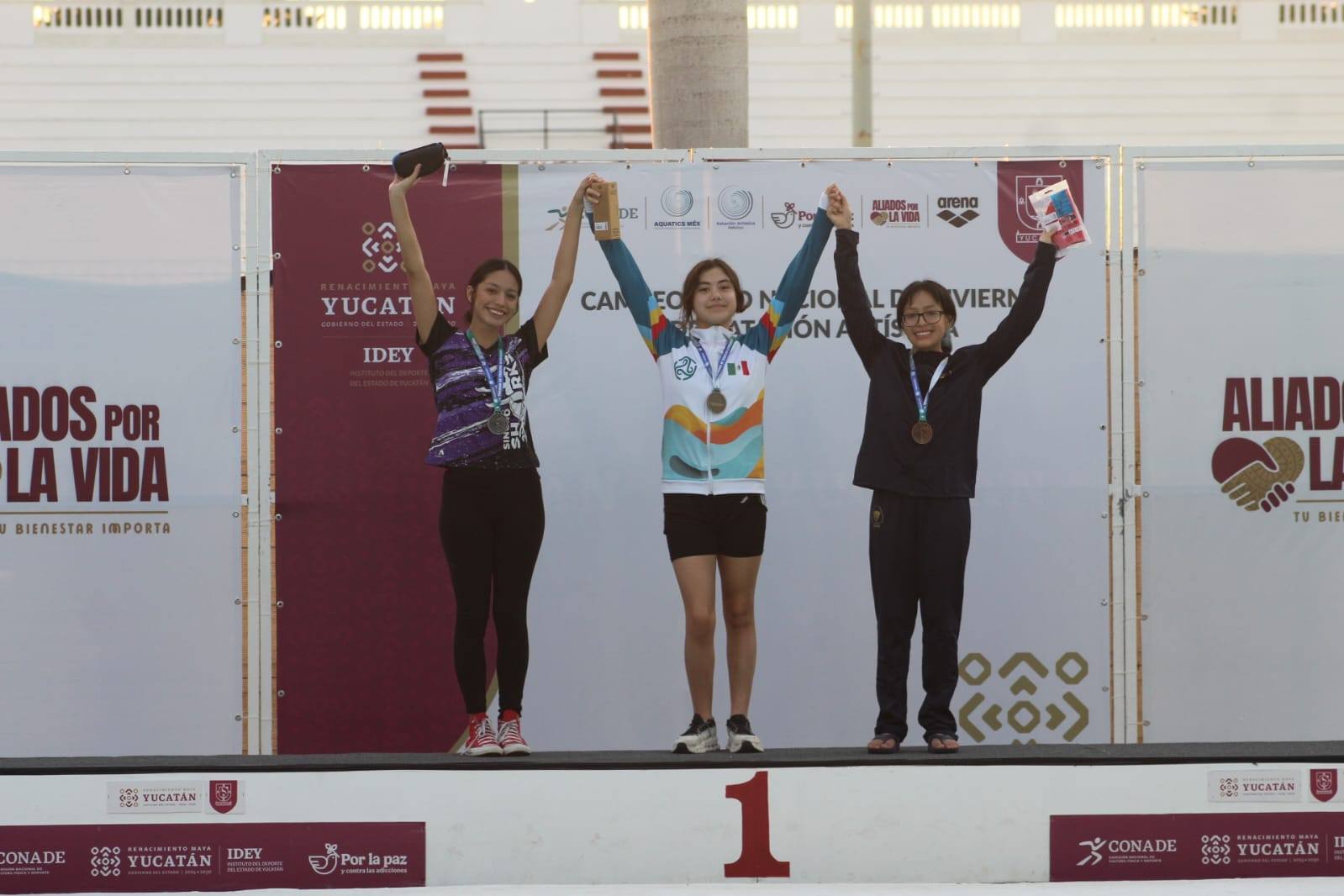 Las otras medallas de oro fueron obtenidas por Jorge Cetz Contreras, del club Nataré, en la prueba de solo masculino infantil mayor, con 66.57 puntos, y por Dara Castillo Feliciano, del mismo club, en la modalidad de solo campeones en desarrollo juvenil, con 69.59 unidades.