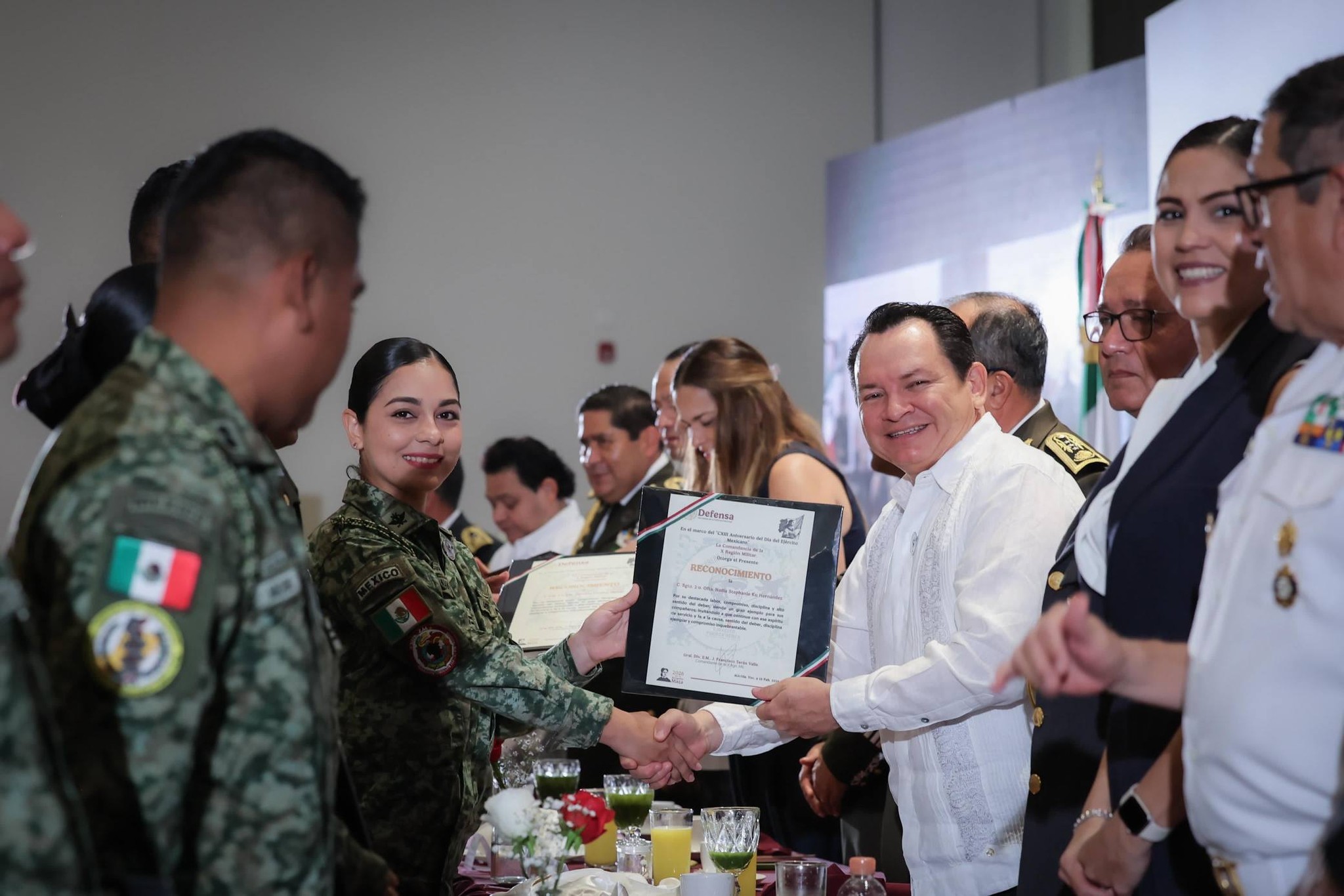 Durante un desayuno realizado en el Centro de Convenciones Yucatán Siglo XXI, el mandatario estatal destacó que el Ejército Mexicano ha acompañado al país en los momentos más trascendentes de su historia, cumpliendo 113 años de lealtad a México y de entrega permanente al pueblo. En el acto, 210 elementos recibieron el reconocimiento y el respaldo del Gobierno del Estado y de la sociedad yucateca por su labor diaria en favor de la soberanía nacional.
